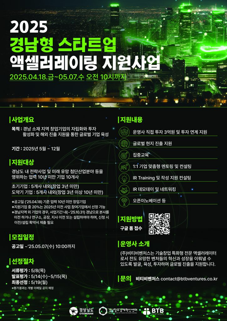 경상남도와 경남창조경제혁신센터가 주관하는 ‘2025년 경남형 스타트업 액셀러레이팅 지원사업’ 운영기관으로 선정된 비티비벤처스는 오는 5월 7일 오전 10시까지 ‘2025년 경남형 스타트업 액셀러레이팅 지원사업’ 참여기업 10개사를 모집한다고 밝혔다.