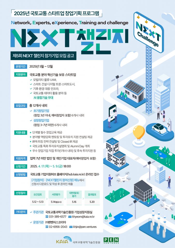 국토교통과학기술진흥원(이하 국토진흥원) 은 국토교통 분야 유망 스타트업을 발굴·육성하기 위한 ‘2025년 국토교통 스타트업 창업기획 프로그램(제5회 NEXT 챌린지)’ 참가기업 모집을 지난 17일 공고했다.