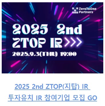 ▪️2025 2nd ZTOP(지탑) IR – 투자유치 IR 참여기업 모집 ~08-14