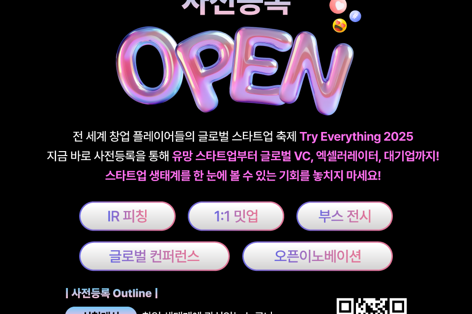 🚀서울특별시 & 매경미디어그룹이 주최하고, 서울경제진흥원(SBA)이 주관하는 국내 최대 글로벌 스타트업 축제 Try Everything 2025가 오는 9월, 서울에서 열립니다!! 📌지금 사전등록하고, 더 편하게! 더 빠르게! 👉사전등록자 행사장 입장 QR 코드를 발급받으세요! 💡예비 창업자부터 스타트업 실무자, 투자자, 학생까지 누구나 사전등록을 통해 혁신 스타트업 전시, 투자자 밋업, 글로벌 콘퍼런스 등 다채로운 프로그램을 한 자리에서 만나보실 수 있습니다. ✔️사전등록 기간: […]